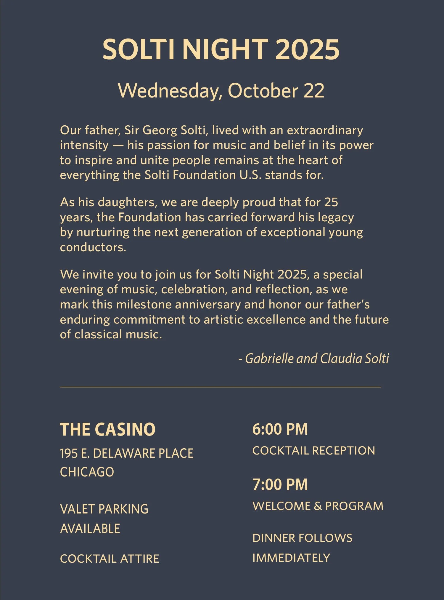 Join us in building a lasting legacy for young American conductors. Please contact us at 847.269.9050 regarding Solti Night benefits associated with this significant $25,000 anniversary gift.